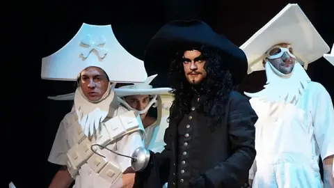 Купить официальные билеты на спектакль Питер Пэн в Московский театр имени Вахтангова. Заказ билетов по телефону (Москва): +7(495)-147-75-16 «Питер Пэн» – спектакль в театре имени Вахтангова в постановке режиссера Александра Коручекова по мотивам сказки Джеймса Барри. Это волшебная сказка, где звезды разговаривают, люди летают, где странное поведение персонажей – норма. Где герой истории мальчик Питер Пэн не хочет становиться взрослым, поэтому он убежал из дома и поселился среди фей в Кенсингтонском парке. Питер Пэн появляется в доме Дарлингов среди ночи, с феей Чинь-Чин с захватывающими рассказами о сказочной стране, увлекая ими детей, и улетает с ними в неведомое прекрасное пространство, где все необычно – времена года меняются ежечасно, где полно русалок, крокодилов, краснокожих индейцев, пиратов. Невообразимое стечение событий, поединков, фантастические истории ожидают Джона, Майка и Венди Дарлингов в компании потерявшихся мальчиков. От смертельной опасности их спасает Питер Пэн, победивший Капитана Крюка. Дети возвращаются в отеческий дом, где их ждут счастливые родители, они вырастают, и только Питер Пэн остается мальчишкой, который с трудом узнает повзрослевших друзей. Александр Коручеков, режиссер: Есть знаковые сказки, которые выходят за рамки детской литературы. Как, например, «Алиса в стране чудес». Такова и история о Питере Пэне, мальчике, который не хотел взрослеть. Питер Пэн – это глубокая история, в ней много пластов. Этому произведению посвящены тома исследований, где выясняют, что такое взрослость, что такое детскость. У Джеймса Барри – есть и пьеса, и повесть о Питере Пэне. Пьеса замечательная, но ее надо ставить на большой сцене, делать мюзикл, в котором использовать машинерию, пригласить акробатов, фокусников, сделать сложный постановочный спектакль. Мы же готовим свою работу на Новой сцене и здесь важны не постановочные эффекты, а игровая суть истории. Ведь детство продолжается, пока человек играет, верит в приключения. Питеру Пэну скучно без игры: он, например, предлагает своим друзьям обедать «понарошку», а когда они понимают, что хотят есть по-настоящему, Питер не дает им возможности покинуть игру, вернуться в реальную жизнь. Игра остается игрой, пока всем весело, пока она в радость. Это очень глубокое и разнообразное произведение, которое исследует важные пласты жизни, ставит проблему неизбежного взросления: как из веселого ребенка – озорника и придумщика – вырастает обыкновенный скучный взрослый человек. Питер не хочет становиться взрослым, ускользает от реальной жизни. Он предпочитает остаться навсегда ребенком. Поэтому он обречен на одиночество. Обратиться к истории о Питере Пэне предложил Римас Туминас, и нам всем эта идея понравилась. Играть спектакль будут студенты IV курса Театрального института имени Б. Щукина. Мне интересно поставить со своими учениками (я – художественный руководитель этого курса) детский спектакль, в который каждый год будут вводиться новые исполнители – очередной выпускной курс. Мы постараемся уйти от иллюстративности и не хотим заигрывать с детьми-зрителями, хотя сценическое пространство предполагает тесный контакт с публикой. Наша задача – разбудить фантазию ребенка, заставить его включаться в ситуации, чтобы нашим маленьким зрителям хотелось дома доиграть, что-то дод